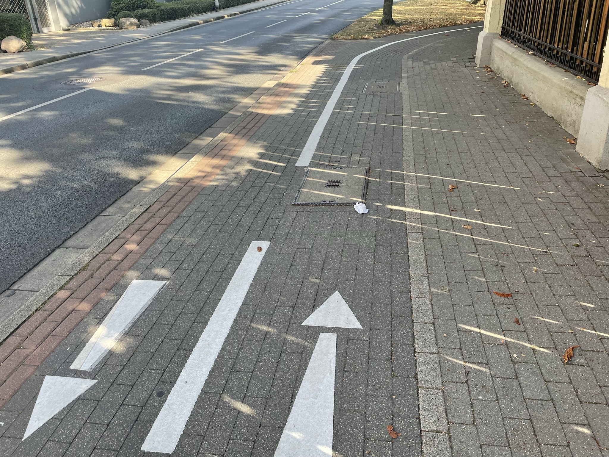 Bitte die Gesamte Strecke VZ239 mit ZZ1022-10, dann dürfte man an der markierten Stelle schon auf die Straße wechseln. | | Ungenügende Wegbreite/Engstellen | 2 | 0 | 12.06.2020 | | Karte |