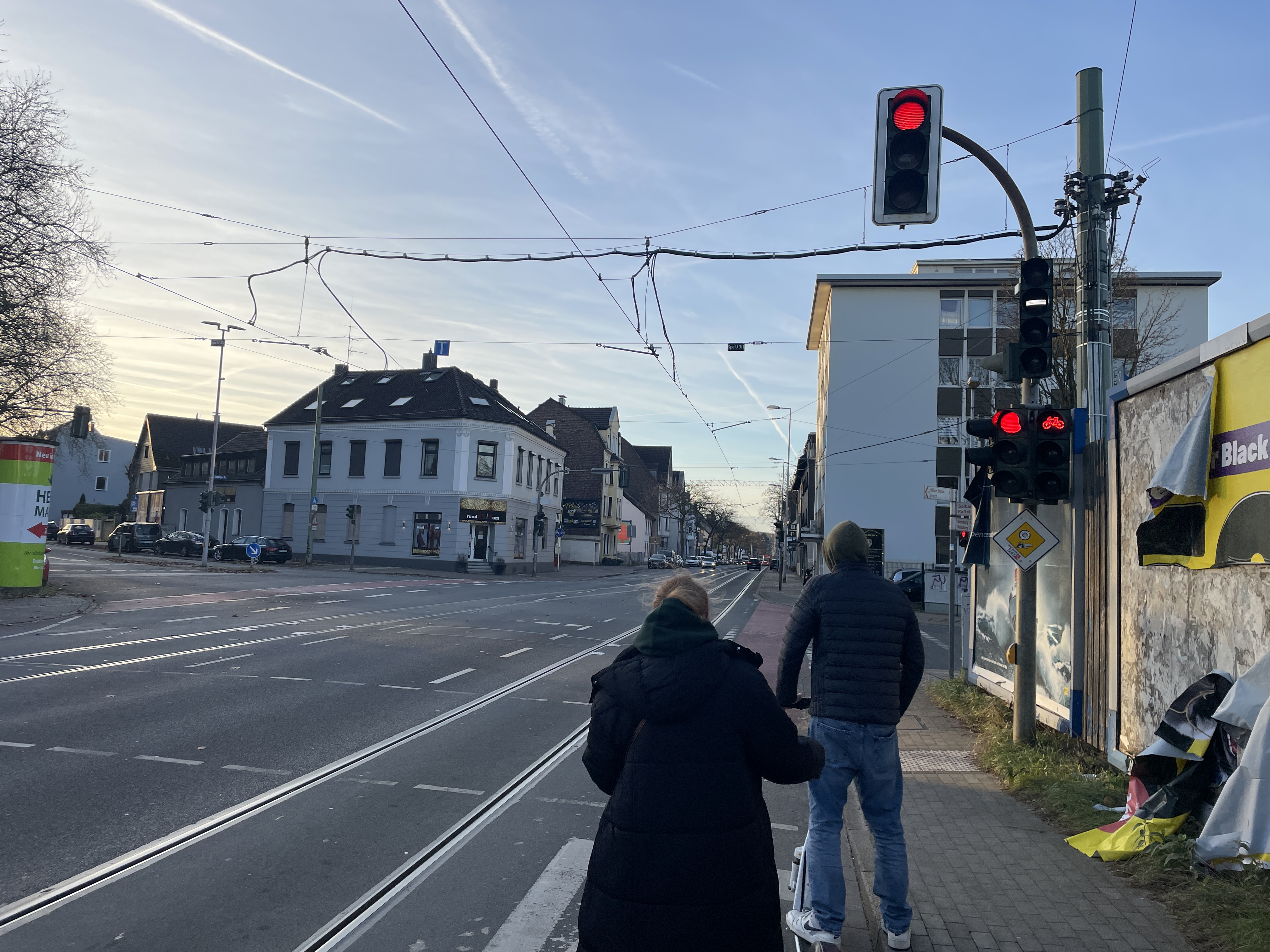 | 407 | PB | Radverkehr | Der Radverkehr auf der Duisburger Straße in FR Duisburg muss entsprechend aktueller Wegführung an der Kreuzung Emmericher Straße auf den links liegenden Zweirichtungsradweg wechseln. Zwar wird Radelnden hier an der Kreuzung durch eigene Signalanlage Vorrang eingeräumt, allerdings muss der Radverkehr dann nach offizieller Führung auf der anderen Straßenseite die Fuß/Radampel nach Links verwenden, um den Radweg zu erreichen. Hier muss dafür zudem ein Anforderung gedrückt werden. Dies übersehen insbesondere ortsunkundige Radelnde regelmäßig und verpassen dadurch eine weitere Ampelphase.
