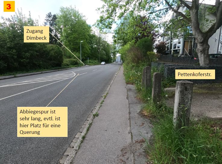 Rechtsabbiegende Autofahrende haben zumeist eine sehr hohe Geschwindigkeit (die Querenden werden spät bemerkt) und erschrecken sich teilweise über den querenden Fuß-Radverkehr. Linksabbiegende aus Richtung Essen kommend haben die querenden zu Fuß gehenden/Radfahrenden noch weniger im Blick. | | Unsichere/fehlende Querungsmöglichkeit | 1 | 0 | 01.06.2020 | | Karte |