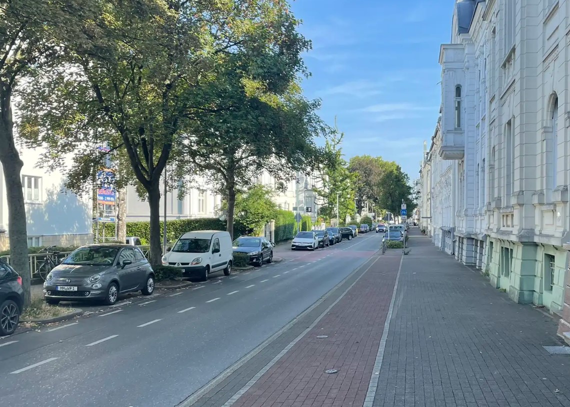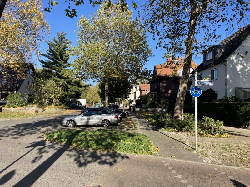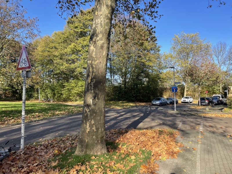 Der Radweg am Lothringer Weg endet jedoch, sobald er auf dem Oemberg trifft. Die Markierung erlaubt es Radfahrende nicht, sicher und ordnungsgemäß auf den Oemberg einzubiegen. Darüber hinaus steht hochgewachsene Bepflanzung in der Sichtachse, so dass Autoverkehr von links kommend erst später gesehen wird.
