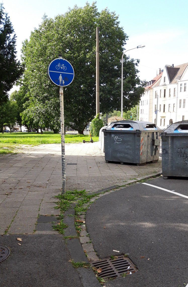 Stadtauswärts weist der Lothringer Weg einen gemeinsamen Fuß- und Radweg auf. Das Schild mit Zeichen 240 ist entsprechend nur in dieser Richtung angebracht. Da es sich um eine Einbahnstraße handelt, wird autofahrenden Anwohnern nicht bewusst sein, dass hier auch Radfahrende zu erwarten sind. In ihrer Fahrrichtung sehen sie das Schild nicht. So ist es hier auch schon zu einem unregistrierten leichten Zusammenstoß zwischen einem in eine Einfahrt einbiegenden Autofahrenden und einem Radfahrenden gekommen.